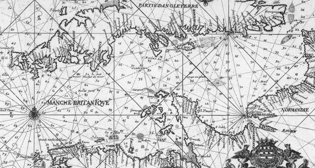 The version of Greenvile Collins’s Large Draught of the Downes at the top of this post is in the New York Public Library and is dated to c.1702–7; the detail is from a later edition. The Visscher print of the Battle of the Downs is in the Rijksmuseum Amsterdam. The Mariners Mirrour (The English Waghenaer) is in the National Maritime Museum, Greenwich.