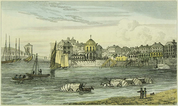 Bathing machines in operation, from A Picture of Margate, and its Vicinity, by W C Oulton, 1820