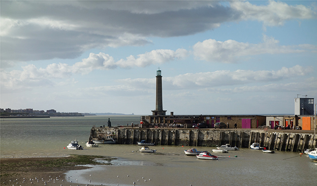 One fine day in February. The blip on the horizon to the left of the lighthouse is an 800-year-old navigation mark – the twin church towers on the cliff at Reculver. The church itself has gone.