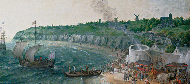 The brewer was probably John Prince who died in 1687, and Lewis thinks his ale was relatively dark. But Northdown ale was famous before Prince’s time, and there was certainly a malting operation up on the cliff above Margate by 1615, around the time the scene at the top of this post was painted. The view of Margate is recognisable and not a generic landscape: a small settlement in a gap in the cliffs, and a few houses climbing up the hill towards Northdown (in another version of this painting the cliffs are whiter). There could be a malthouse or brewhouse behind the plume of smoke, but there’s nothing conclusive about it. On the other hand the enormous lime kiln from which the smoke rises, built on the shore more or less where Turner Contemporary now sits, clearly appealed to Willaerts. Lewis doesn’t mention it, so presumably it was gone by 1723, although the long list of charges he records for lading or unlading goods at Margate pier includes lime, along with malt, beer and ale.