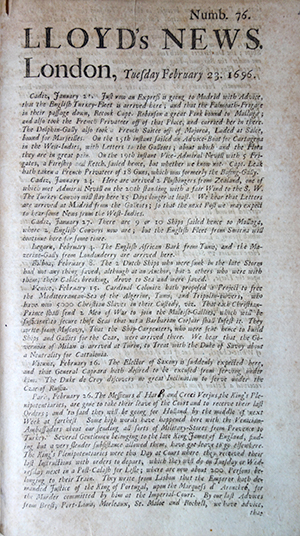 As a whodunnit this story is unsatisfactory. Who provoked that small incident in newspaper history remains unanswered, possibly unanswerable. Just as interesting though, and going largely unnoticed, is the fact that the bread-and-butter work which sustained the vast religious output of Tace Sowle’s celebrated printing house was Edward Lloyd’s yet more celebrated marine list. The two worlds, or at least their historians, seem to be no less separate now than they were three centuries ago. For 20 years from 1692 these two individuals could have passed each other every day on Lombard Street; at some point the two houses also began to do business with each other.