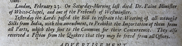 Three days later Ichabod Dawks’s Protestant Mercury reported (with a smirk, one imagines) that the Lords had demanded a correction, on the grounds that the Quaker item was untrue. Lloyd (taking the Murdochian option) abruptly closed down his paper instead, saying the line had been added by the printer. Nonetheless, a Quaker petition to the Lords did exist.
