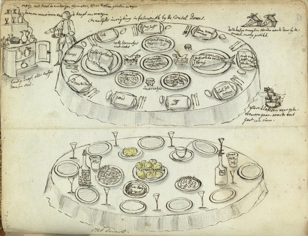 The Holland sailed from the Texel on 23 May. About two weeks later the ship put in at Falmouth in Cornwall and remained there for some days, waiting for a favourable wind. Some of the passengers went ashore. There was an invitation to dinner at the house of Mr Dowe, the consul for the Dutch Republic, and Brandes recorded the whole thing in his sketchbook – the seating plan, the table setting and the dishes served, both main course and dessert. A monogram marks his own place, two to the right of the consul. On the consul’s left is ‘Kemps’, probably Arthur Kempe, who had served as a lieutenant in HMS Adventure on Captain James Cook’s second expedition, and would later be an admiral. To Brandes’s left is a Lutheran predikant (minister) named Goudoever and to his right is the Lutheran’s wife. At the far right facing the fish is an old English teacher who is mother of the consul, and opposite Brandes is a young teacher (I think – someone familiar with Dutch could provide more reliable translations).